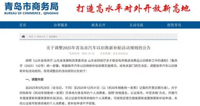 本公告未规定事项,仍按《2025 年青岛市汽车以旧换新补贴实施细则》(青商字〔2025〕7 号)的有关规定执行。本公告由青岛市商务局负责解释。