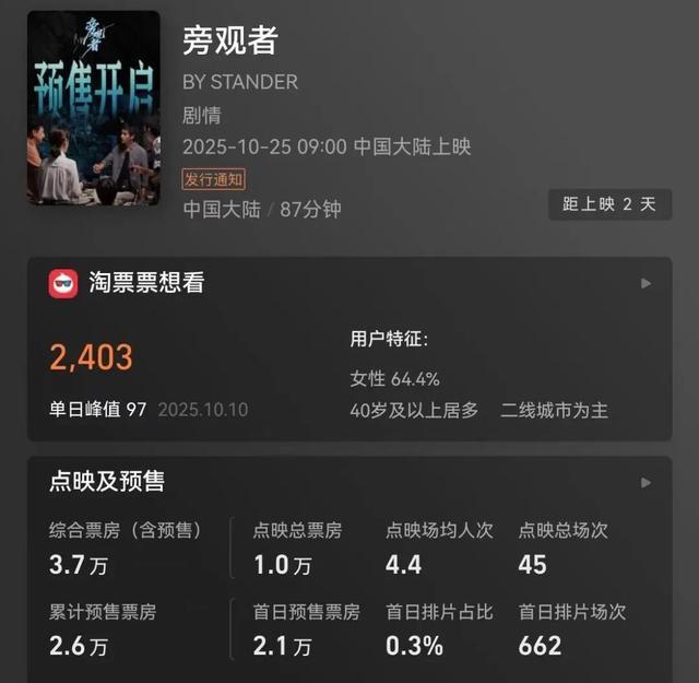 陈坤主演电影《旁观者》宣布撤档,预售票房仅3.7万