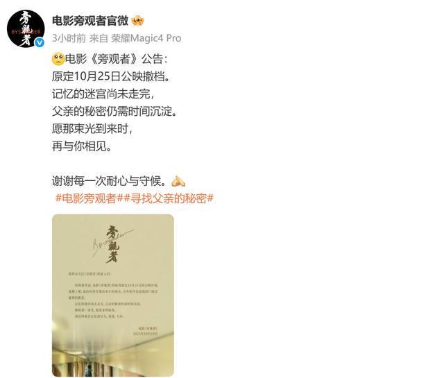 10月23日,电影《旁观者》发文宣布撤档:“经慎重考虑,电影《旁观者》将取消原定10月25日的公映计划,延期上映。我们向所有期待本片的观众、合作伙伴及院线同仁致以诚挚的歉意。”