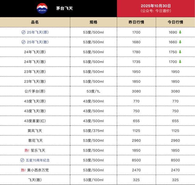 今日酒价披露的批发参考价显示,10月30日,25年飞天茅台原箱较前一日下跌10元,报1690元/瓶;25年飞天茅台散瓶较前一日下跌20元,报1660元/瓶。24年飞天茅台原箱较前一日下跌30元,报1750元/瓶;24年飞天茅台散瓶较前一日下跌35元,报1700元/瓶。
