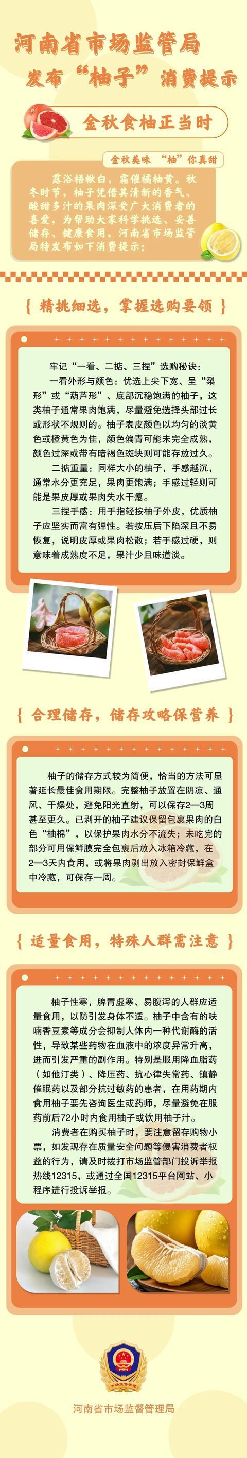 露浴梧楸白,霜催橘柚黄。秋冬时节,柚子凭借其清新的香气、酸甜多汁的果肉深受广大消费者的喜爱,为帮助大家科学挑选、妥善储存、健康食用,河南省市场监管局特发布如下消费提示: