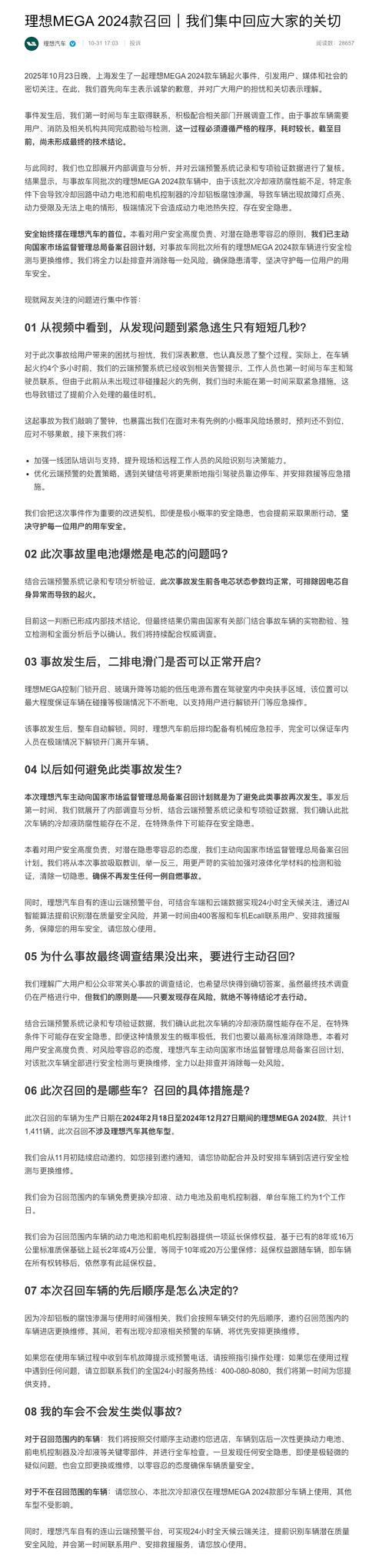 31日,理想汽车发布公告称,2025年10月23日晚,上海发生了一起理想MEGA 2024款车辆起火事件,引发用户、媒体和社会的密切关注。【详情】在此,我们首先向车主表示诚挚的歉意,并对广大用户的担忧和关切表示理解。