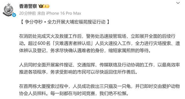 此前,11月29日,香港警务处官方微博@香港警察发文,称全力开展大埔宏福苑搜证行动。