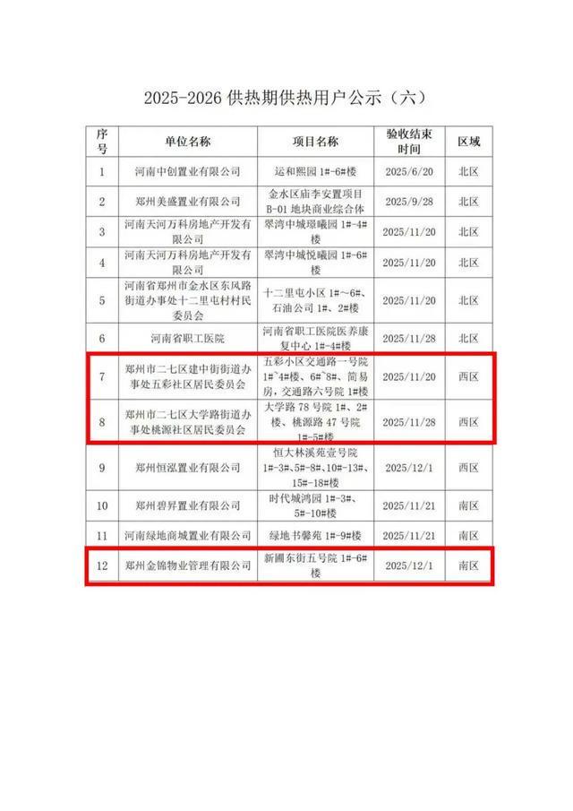 我公司根据项目所在区域热源调度情况,按已公示用户工程验收合格名单先后时间排列,确定第六批用户,用热项目12个,报装用热建筑面积:82.28万平方米,到热力集团办结相关用热手续后,在2025-2026供热期予以供热。其余供热工程验收合格用户,我公司会根据区域热源调度情况,分批按排序确定供热用户,第一时间通知办理相关手续,请耐心等待。