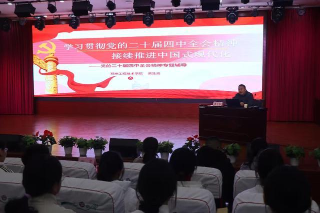 12月2日下午,郑州市第八十中学报告厅内气氛庄重而热烈,一场以“学习贯彻党的二十届四中全会精神 接续推进中国式现代化”为主题的宣讲在此举行。郑州市委宣讲团成员、郑州工程技术学院马克思主义学院党总支书记柴生高教授作专题辅导。全校300余名师生共同聆听了这场富有思想深度和时代温度的宣讲。
