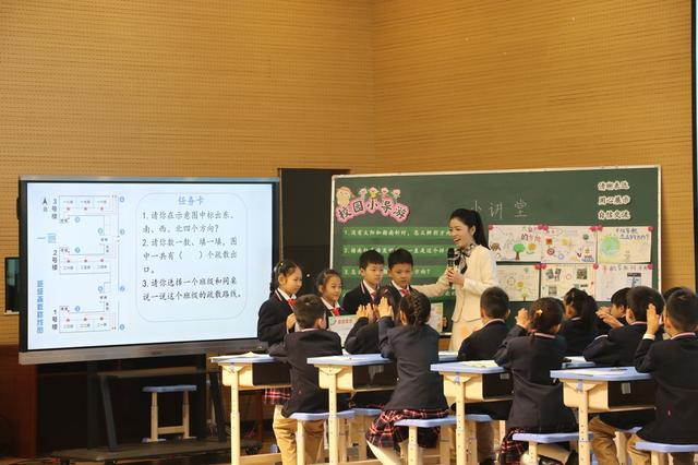 课例展示中,冯老师以《校园小导游》为主题并立足二年级学生认知特点,将数学知识与校园场景融合,以任务驱动引导学生课前调查、分享交流、实践运用,在趣味体验中夯实方位认知等知识,提升综合能力,展现良好学习风貌。