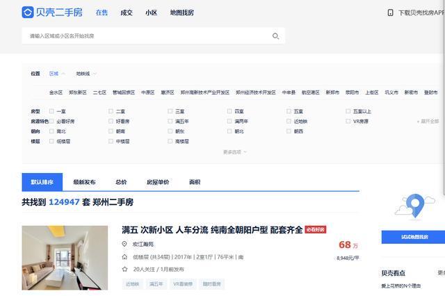 打开“贝壳”找房APP,城市定位郑州,页面显示,目前在售的二手房124947套,在售新房楼盘507个。