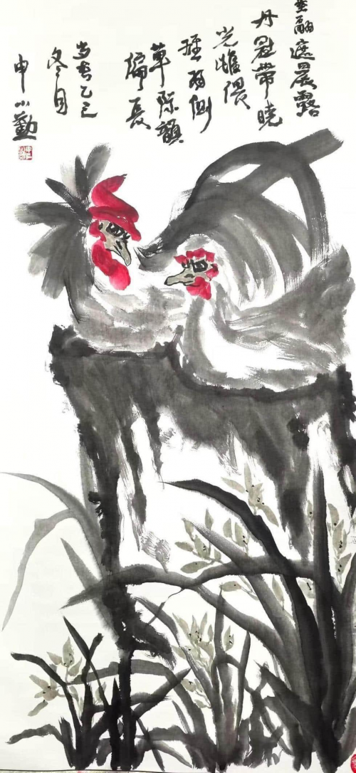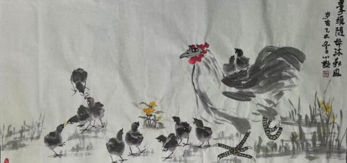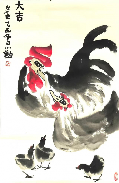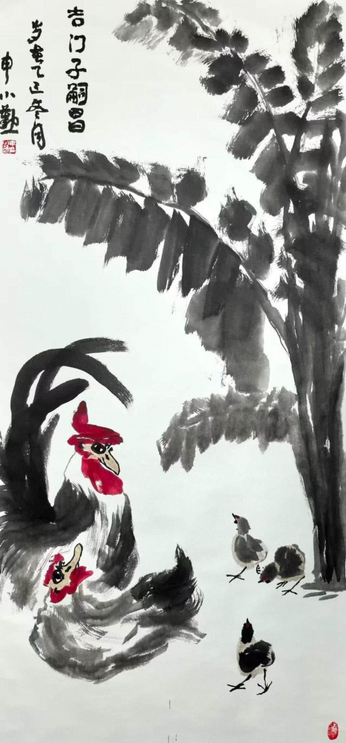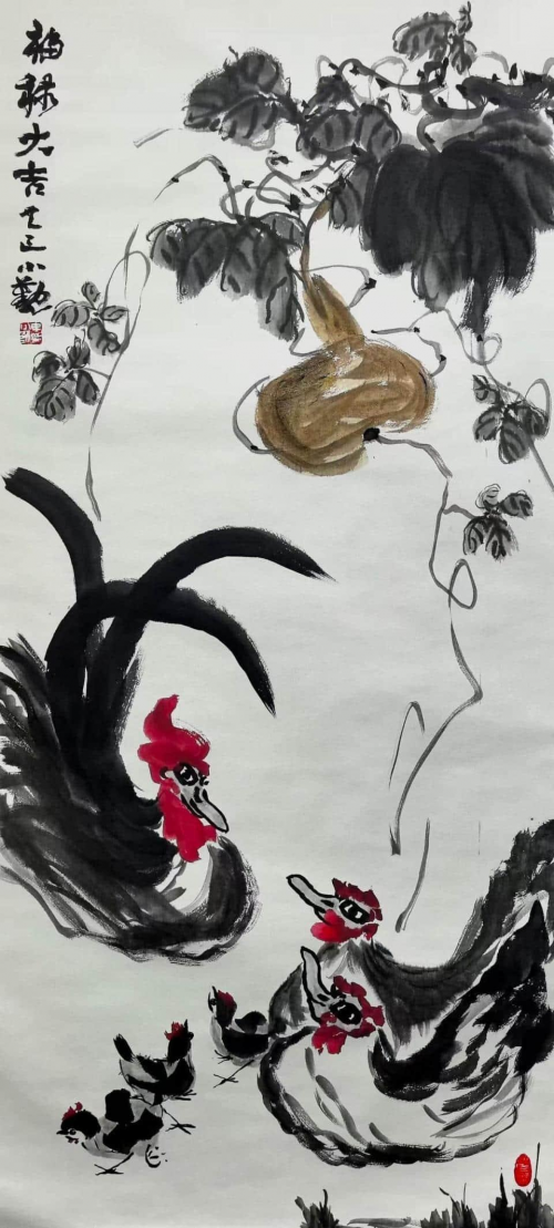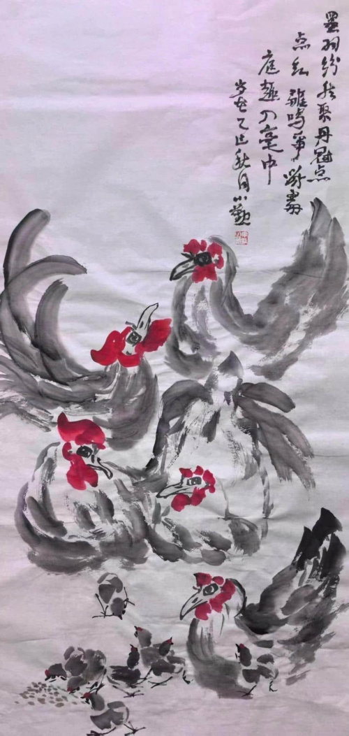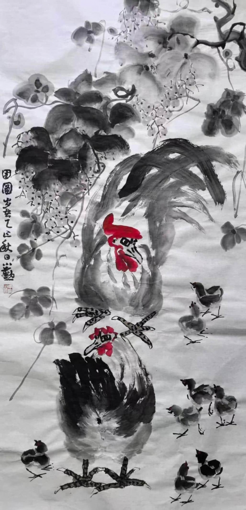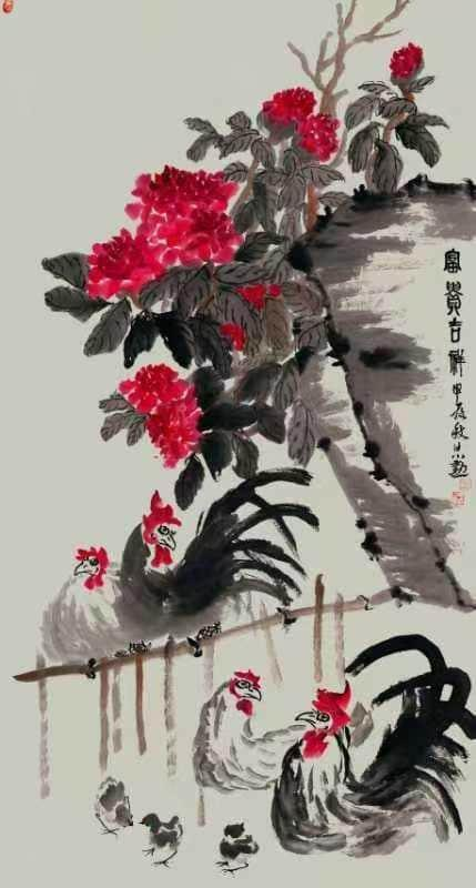她擅长画禽鸟、兰花,犹喜画鸡;画作中,那些鸡的形象无疑是最为引人注目的;在她的笔下,鸡的眼眸呈方形,目光如炬, 鸡的形象被刻画得栩栩如生, 犹如寓言中的神鸡降临凡间;这些鸡的眼眸形状独特,生动地描绘出了鸡的神态,流露出一种难以言喻的灵性,这些鸡的形态各异,有的威猛雄壮,有的温婉柔美,展现出了鸡的不同面貌和性格。她的绘画风格独特,色彩运用恰到好处,使得画作中的每一处都充满着深邃的意境,以其独特的绘画风格为我们呈现了一幅幅别具一格的艺术画卷。