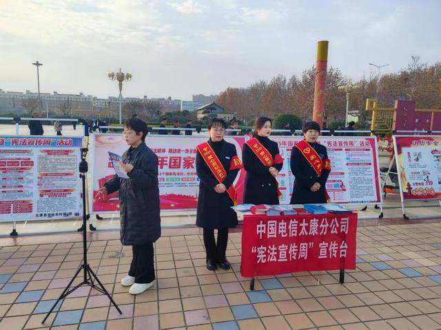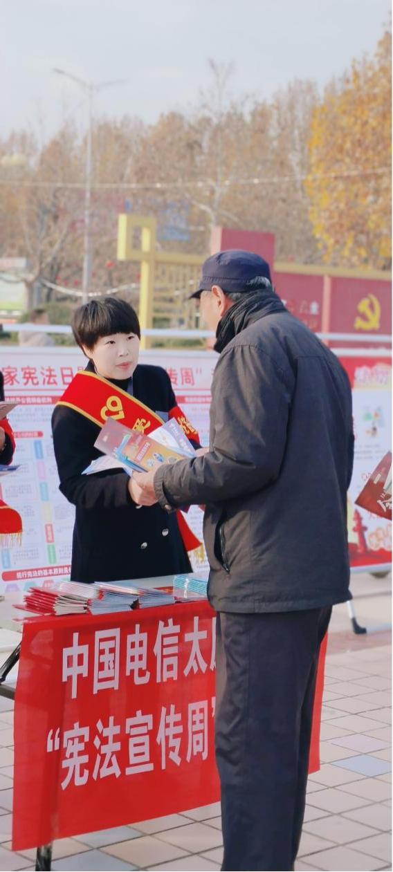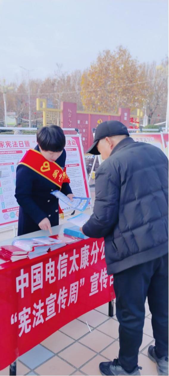 近日,为深入弘扬宪法精神、普及法治知识,中国电信周口分公司组织太康县营业部自营厅“爱心翼站”于宪法日当天,在太康县中心广场联合开展“暖心翼站与‘宪’相约——法治服务零距离”主题活动,以实际行动践行社会责任,让法治暖流浸润群众心田。