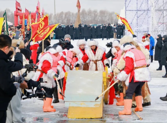 采冰节完整保留了迎风旗、震天鼓、祈福词、出征酒等传统采冰民俗仪式。活动现场,“冰把头”登场宣读祈福词:“感自然之伟力,谢江河之浩荡,承祖先之技艺,采造化之灵光……”随后,采冰汉子们齐饮壮行酒,在鼓声伴奏下开始采冰作业。