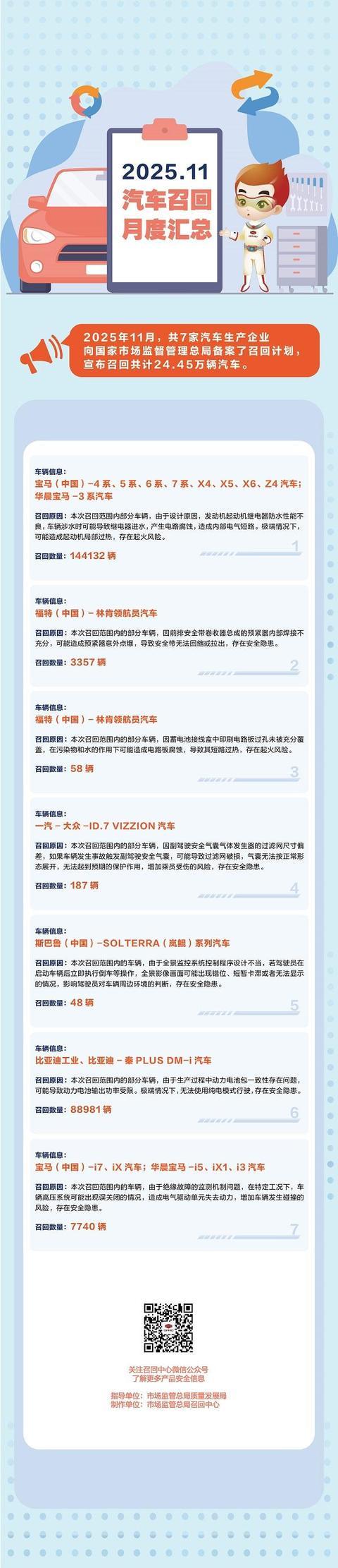 市场监管总局:11月汽车生产企业共召回24.45万辆汽车