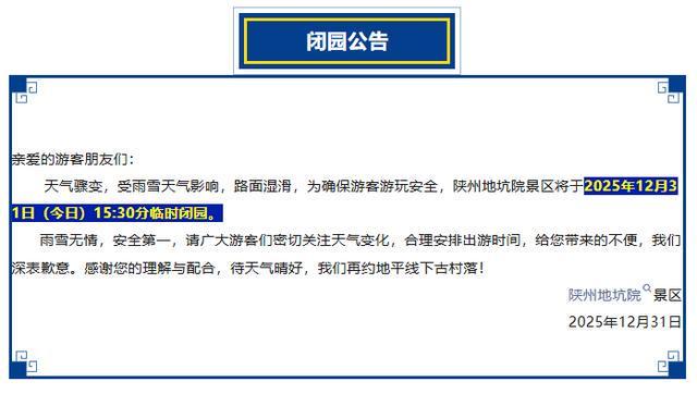 天气骤变,受雨雪天气影响,路面湿滑,为确保游客游玩安全,陕州地坑院景区于2025年12月31日(今日)15:30分临时闭园。
