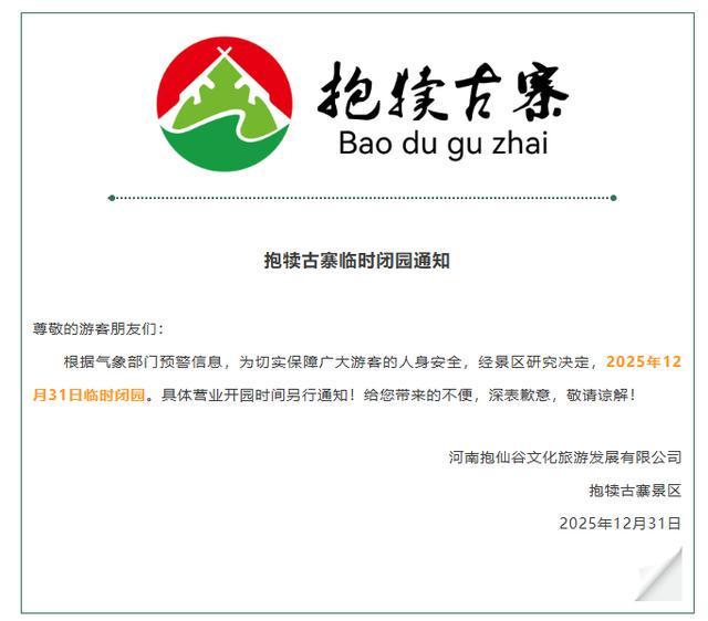 根据气象部门预警信息,为切实保障广大游客的人身安全,经景区研究决定,2025年12月31日临时闭园。具体营业开园时间另行通知!
