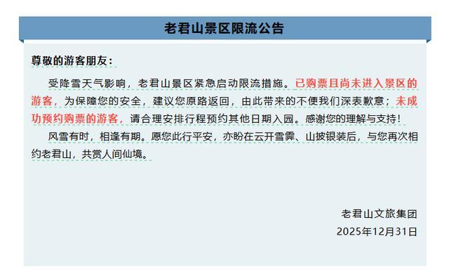 受降雪天气影响,老君山景区紧急启动限流措施。已购票且尚未进入景区的游客,为保障您的安全,建议您原路返回;未成功预约购票的游客,请合理安排行程预约其他日期入园。