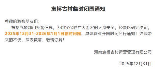 根据气象部门预警信息,为切实保障广大游客的人身安全,经景区研究决定,2025年12月31-2026年1月1日临时闭园。具体营业开园时间另行通知!