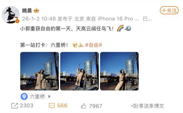 同日,@姚晨 发文称:小郭重获自由的第一天,天高云阔任鸟飞!