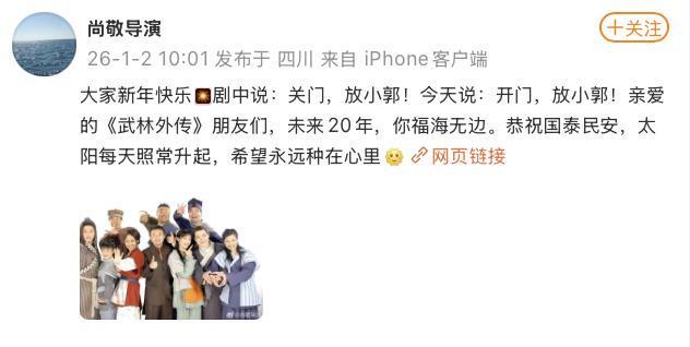 @尚敬导演 也发文回应《武林外传》开播20年称,亲爱的《武林外传》朋友们,未来20年,你福海无边。恭祝国泰民安,太阳每天照常升起,希望永远种在心里。