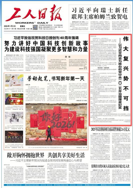 1月2日出版的《工人日报》刊发《伟大复兴势不可挡——以习近平同志为核心的党中央二〇二五年治国理政纪实》