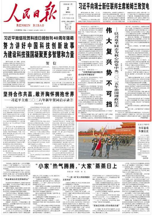 1月2日出版的《人民日报》刊发《伟大复兴势不可挡——以习近平同志为核心的党中央二〇二五年治国理政纪实》