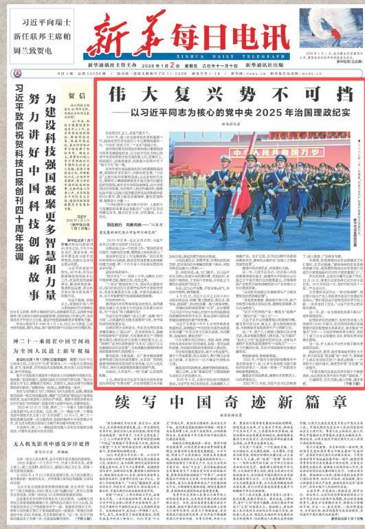 1月2日出版的《新华每日电讯》刊发《伟大复兴势不可挡——以习近平同志为核心的党中央二〇二五年治国理政纪实》