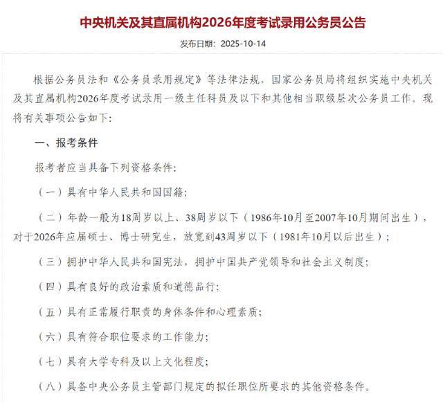 中央机关及其直属机构2026年度考试录用公务员公告显示,报考者年龄一般为18周岁以上、38周岁以下(1986年10月至2007年10月期间出生),对于2026年应届硕士、博士研究生,放宽到43周岁以下(1981年10月以后出生)。
