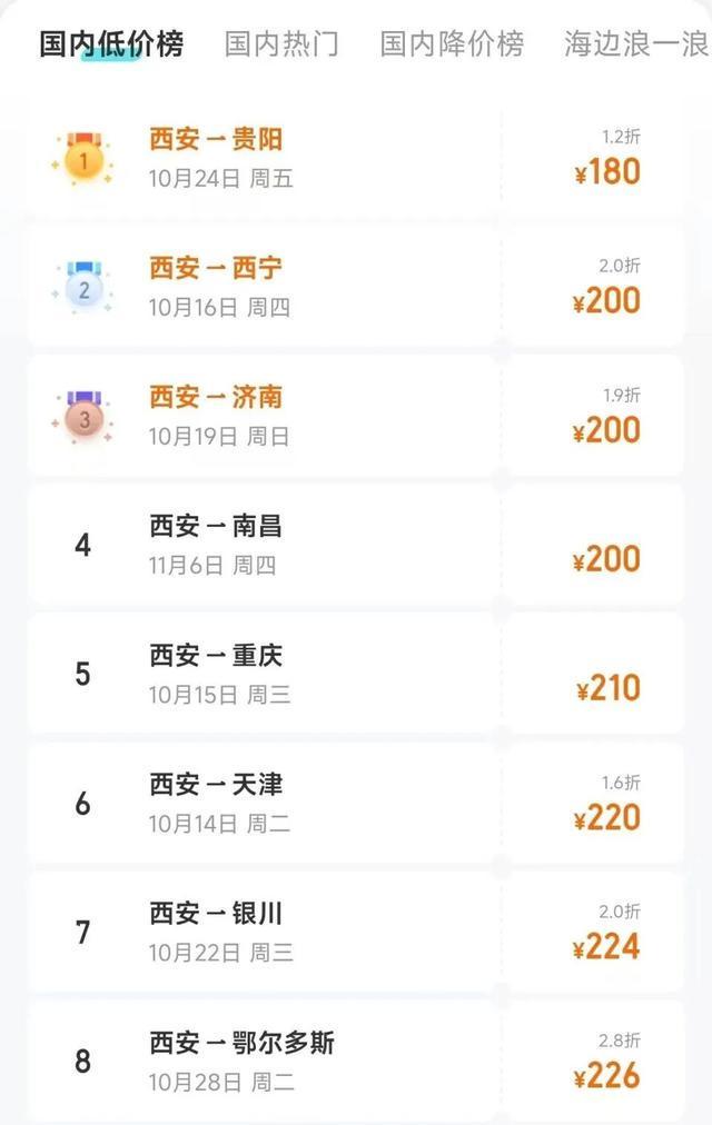 有媒体记者在查询某第三方平台发现,10月中下旬至11月上旬,西安飞往贵阳、西宁、济南、天津等地机票最低可至1.2折;从上海出发前往哈尔滨、沈阳、青岛、厦门、温州等热门旅游城市的机票价格大幅下降,最低甚至达到0.7折。从广州出发到济南、南京等热门城市单程机票价格低至百元。