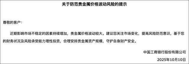 近日,工商银行、建设银行等多家银行发布提示,近期国内外贵金属价格波动加剧,市场风险提升。建议投资者基于财务状况及风险承受能力理性投资,合理安排贵金属资产规模。